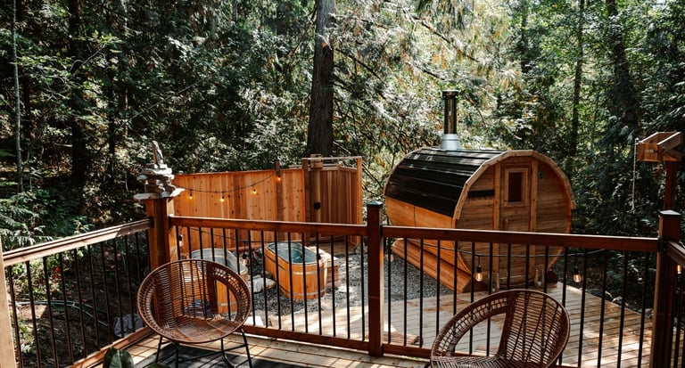 Nestled in the serene wilderness, of Shawnigan Lake, Nyübu features rustic elegance with cozy fire pits, cold plunge tubs, and a cedar sauna. The picturesque setting enhances the ambiance, making each bite even more memorable. Take breaks between courses to engage in the spa's hot and cold amenities and enhance your connection to the surroundings, to the meals, and to each other.